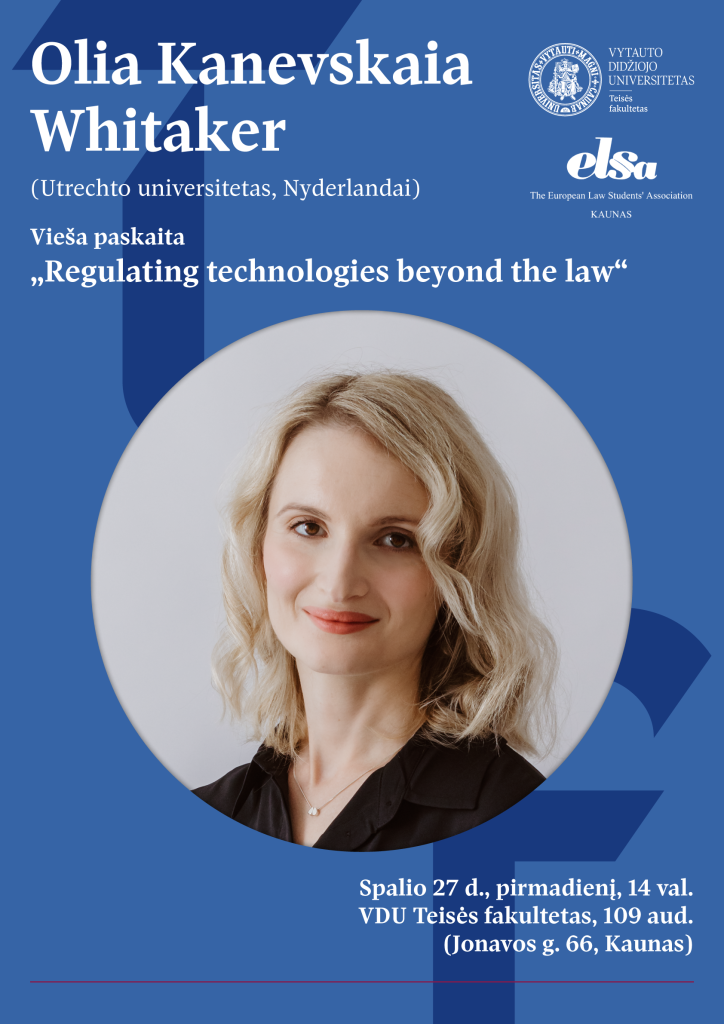 Teisės fakultetas ir ELSA Kaunas spalio 27 d. kviečia į Utrechto universiteto dėstytojos viešą paskaitą „Regulating technologies beyond the law”.
